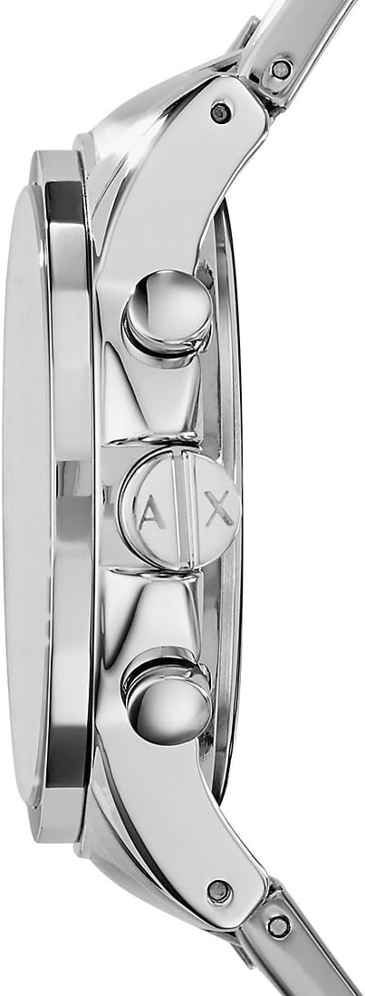 Een sportieve H-Link-armband verankert een gewaagde blauwe chronograaf wijzerplaat met zilverkleurige accenten in dit unisex roestvrijstalen horloge door Armani Exchange.