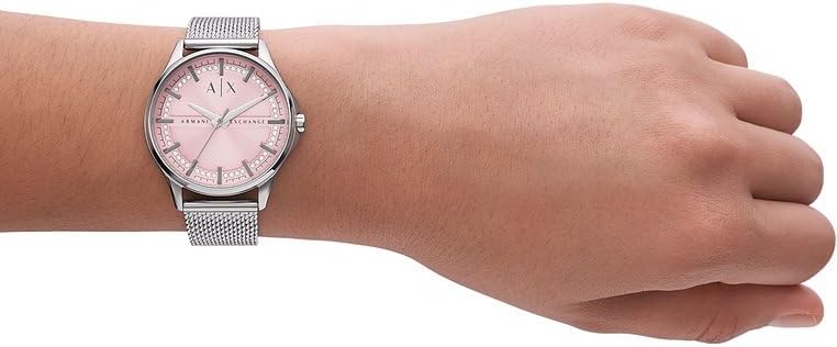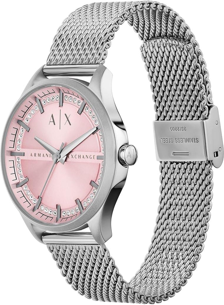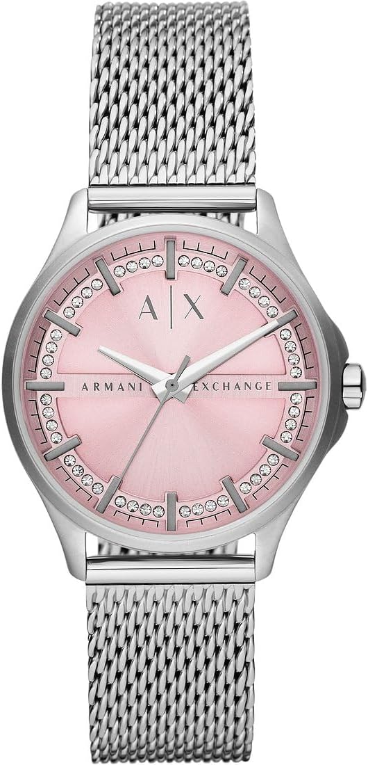 Dit Armani Exchange horloge van 36 mm heeft een roze sunray-wijzerplaat, uurwerk met drie wijzers en een roestvrijstalen mesh bandje.