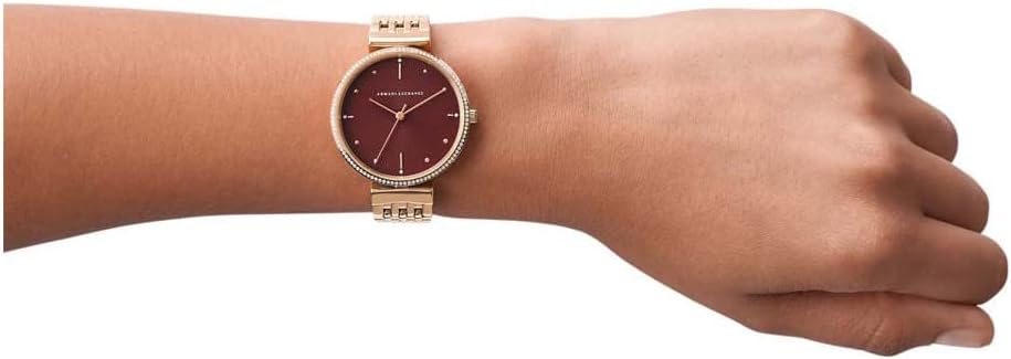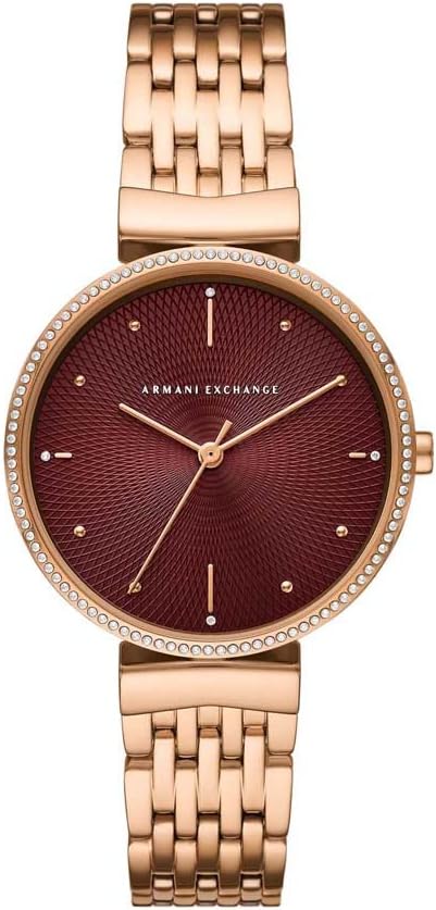 Dit Armani Exchange horloge van 36 mm heeft een rode sunray getextureerde wijzerplaat met roségoudkleurige uuraanduiding, uurwerk met drie wijzers en een roségoudkleurige roestvrijstalen armband.