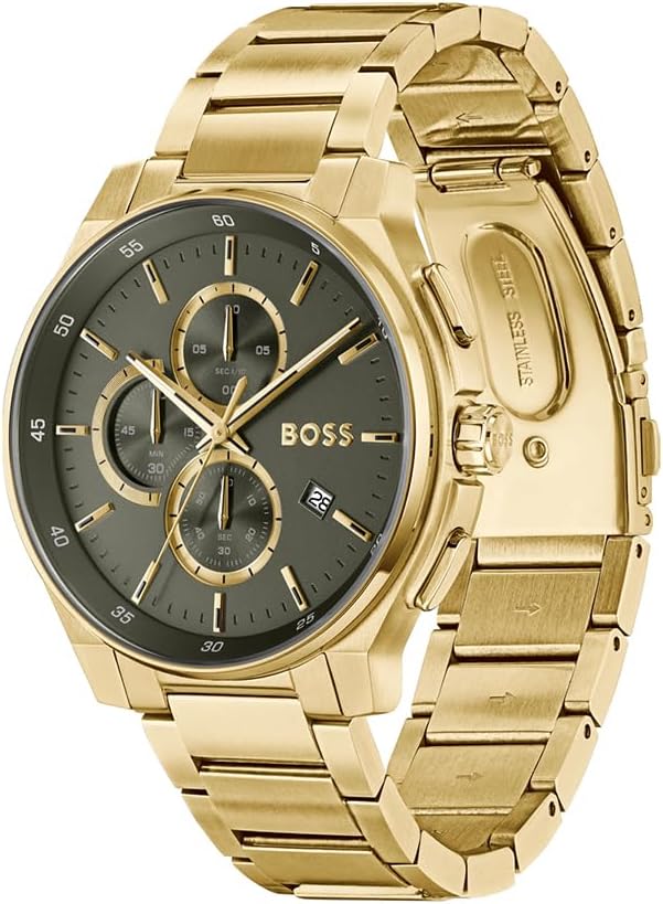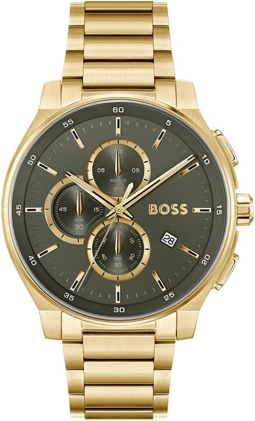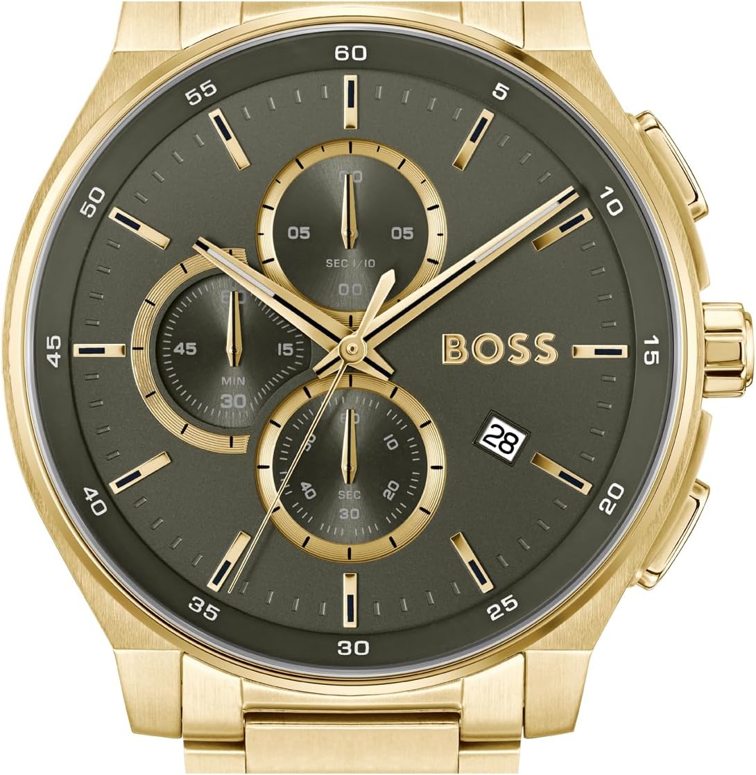 - Hedendaagse olijfgroene wijzerplaat met overlappende subwijzerplaten: dubbellaagse, super-matte olijfgroene wijzerplaat met overlappende subwijzerplaten voor een unieke, moderne esthetiek die kenmerkend is BOSS