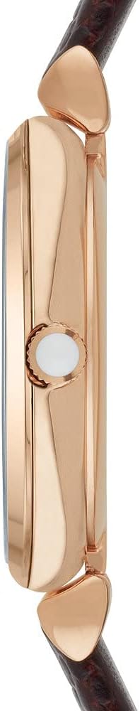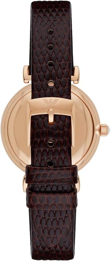 Dit Emporio Armani dameshorloge heeft een roségoudkleurige roestvrijstalen behuizing, een witte parelmoer wijzerplaat met bloemenpatroon en een smalle bruine leren band met hagedis-reliëf.