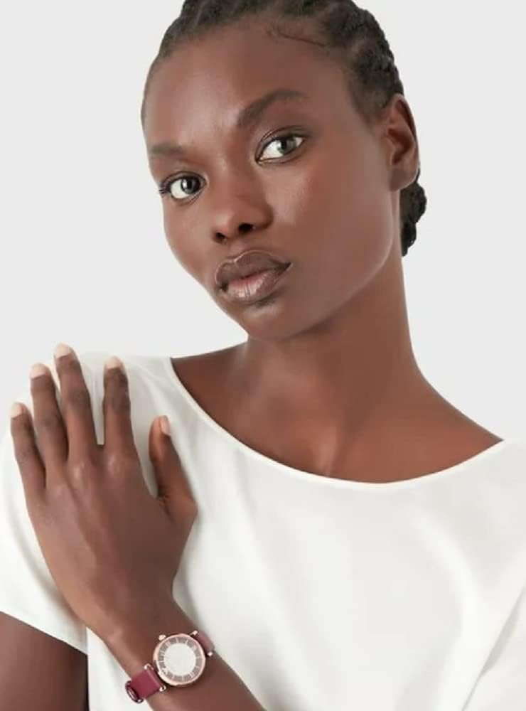 Dit Emporio Armani horloge van 32 mm heeft een bordeauxrode wijzerplaat met volledige pavé steentjes, kast van minimaal 50% gerecycled roestvrij staal, uurwerk met twee wijzers en een bordeauxrood leren bandje.