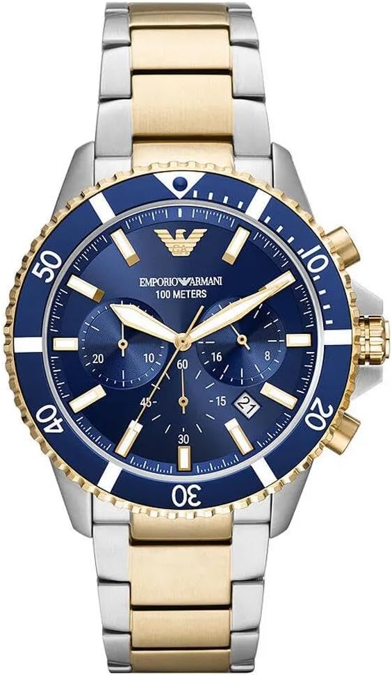 Dit Emporio Armani horloge van 43 mm heeft een blauwe cd-afwerking, sunray-wijzerplaat, lichtgevende streepjes als uuraanduiding, chronograaf uurwerk en een tweekleurige roestvrijstalen armband.