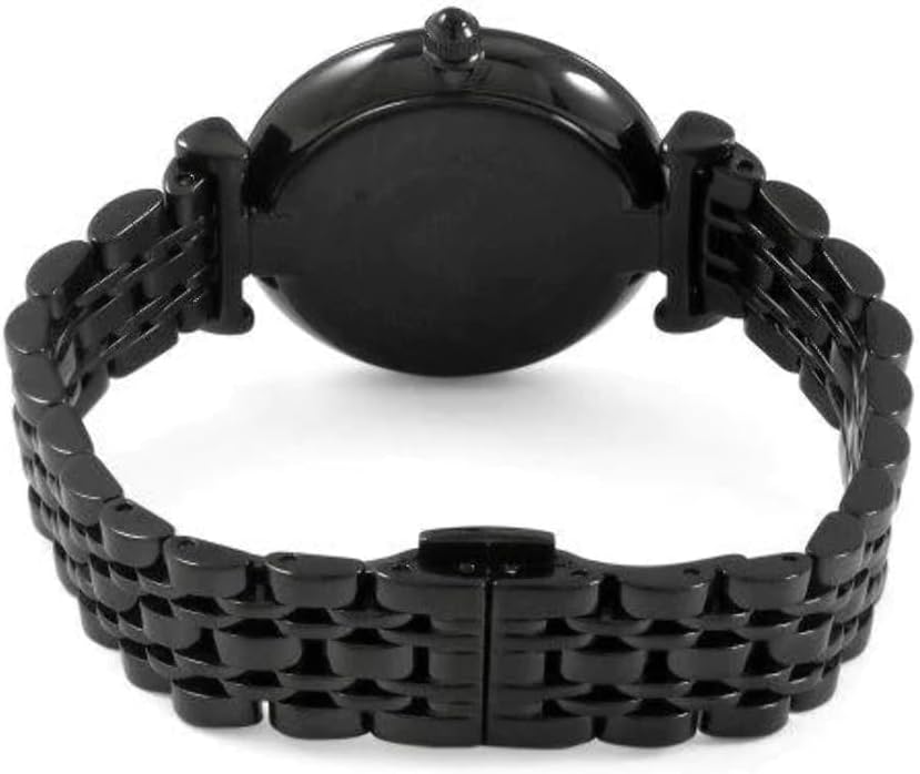 Dit 32 mm-horloge is voorzien van een zwarte wijzerplaat met Pavé-stenen, ROSE GOUD-TONE Romeinse cijfers en stokindexen, tweehandige beweging en zwarte roestvrijstalen armband.