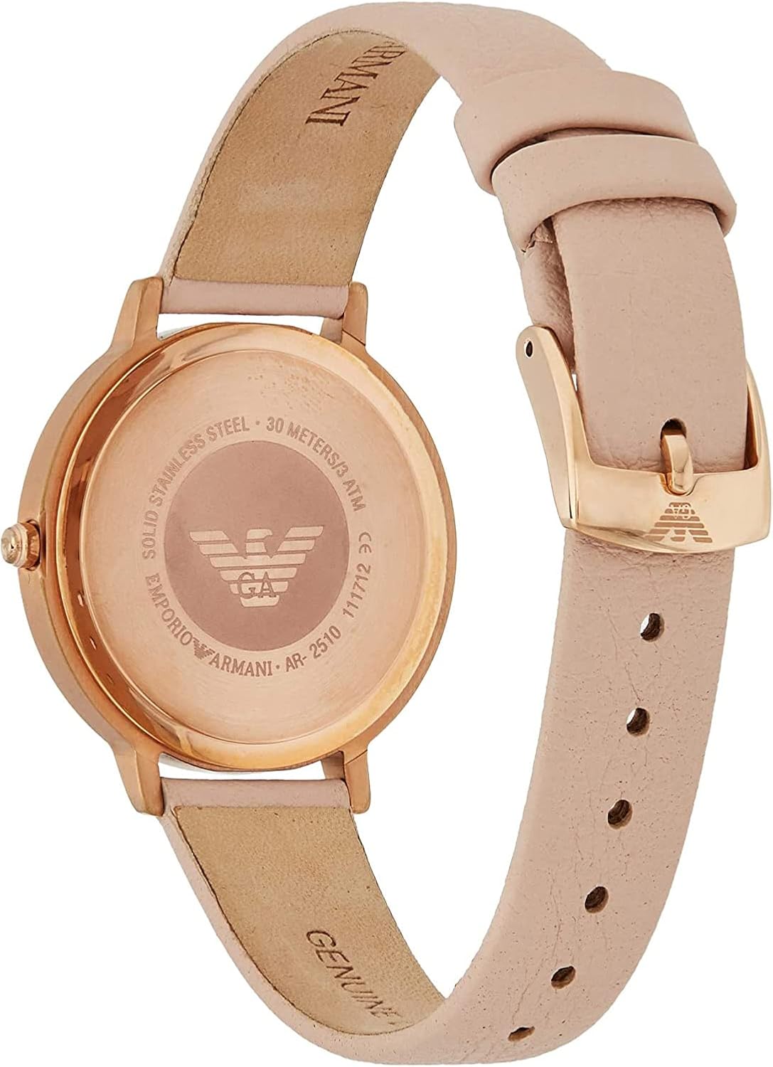 Eenvoudig en feMinin. Dit Emporio Armani dameshorloge met roségouden behuizing heeft een witte parelmoer wijzerplaat, facetgeslepen glazen stenen als indexen en een nude kleur
