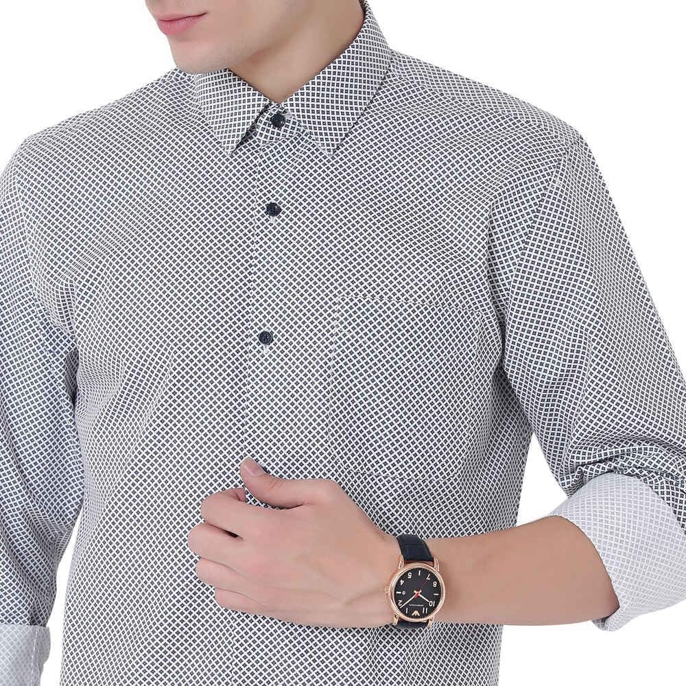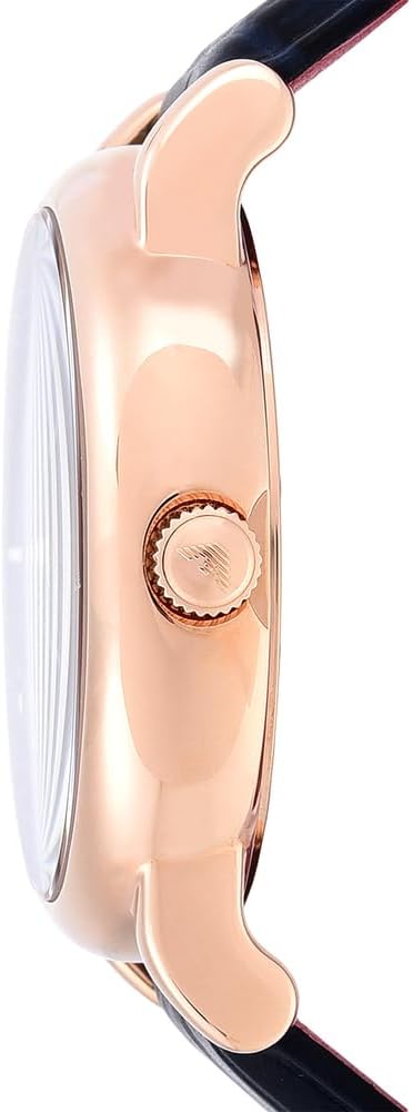 Dit stijlvolle Emporio Armani herenhorloge met gepolijste, roségoudkleurige behuizing heeft een blauwe Sunray-wijzerplaat met witte Arabische cijfers. Daartoe behoort een blauwe leren band met krokodillenreliëf