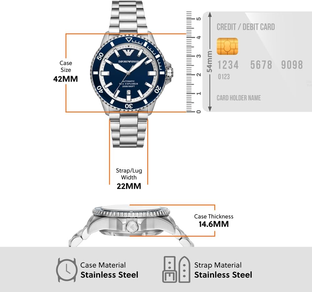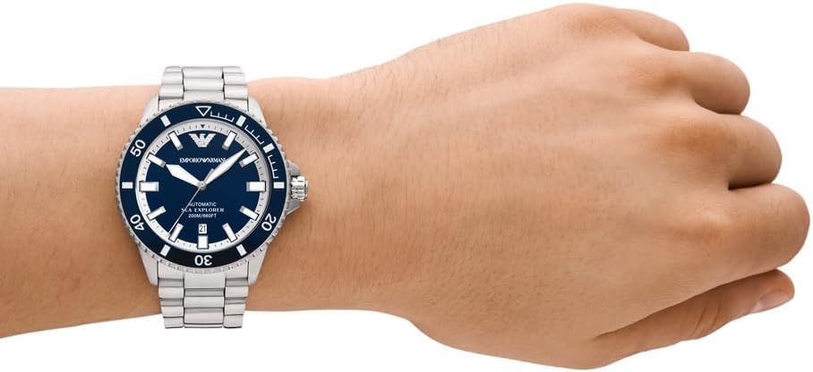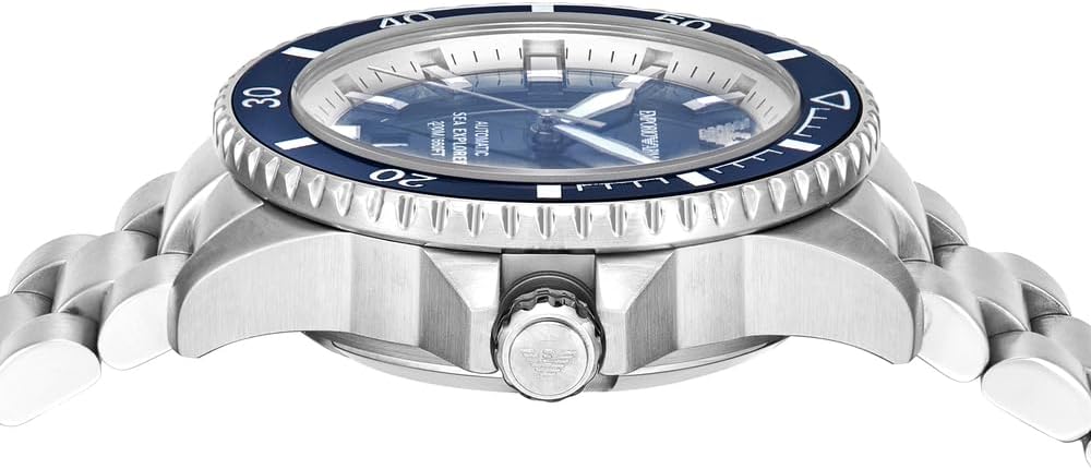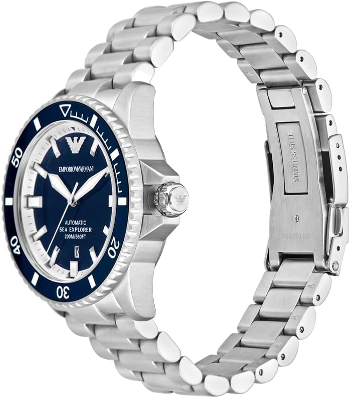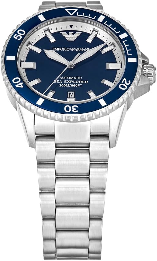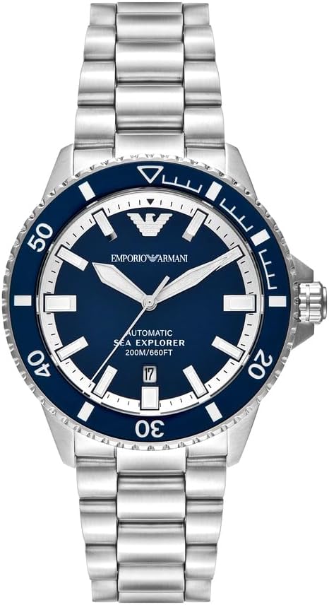 Emporio Armani Het horloge van 42,5 mm is voorzien van een glanzende blauwe geëmailleerde wijzerplaat, een blauwe aluminium bezel insert, Super-LumiNova op handen, indexen en bezelmarkeringen, saffierkristal, automatisch uurwerk, 20 ATM, een geschroefde kroon en roestvrijstalen armband.