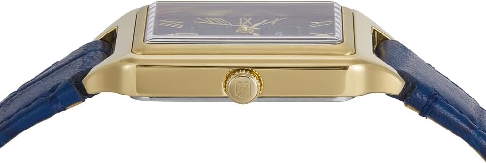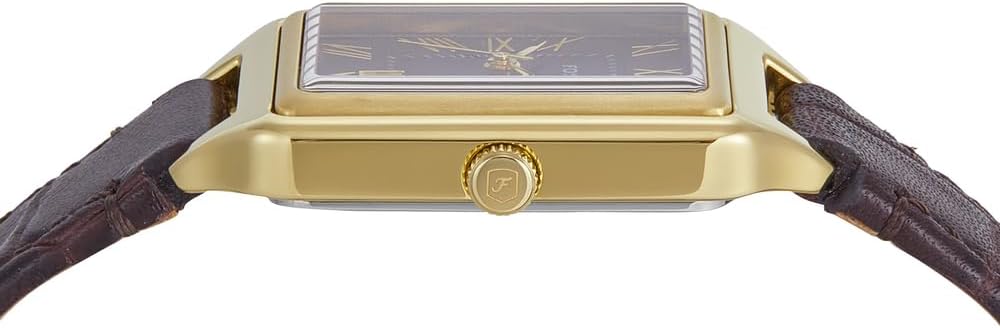 - Rechthoekige roestvrijstalen behuizing met bruine wijzerplaat.