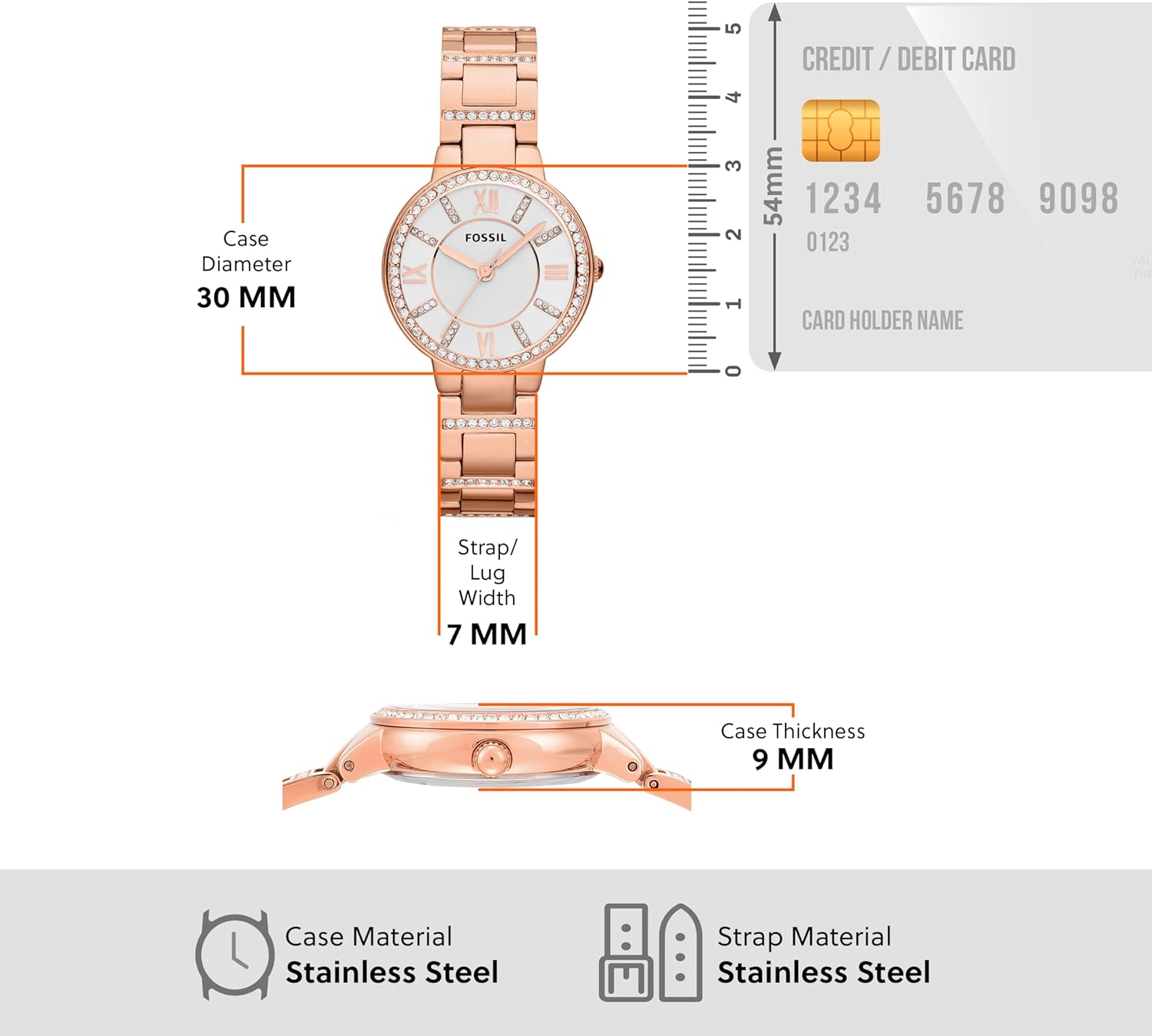 Verbazingwekkend verfijnd, het Fossil Virginia dameshorloge in roségoud met kristallen bezel en Adjust-O-Matic Links voegt meer dan een vleugje glans toe aan je look. Met een klassiek silhouet en innovatieve Adjust-O-Matic-schakels voor een perfecte pasvorm elke keer, heeft dit horloge kristallen accenten op de wijzerplaat, wijzerplaat en band, waardoor het een sprankelende en elegante uitstraling krijgt. Dit horloge is een klassieker.