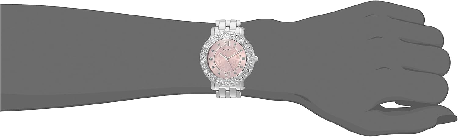 Bekijk Sizing Guide Laat dit kleine Guess horloge een opvallende toevoeging aan uw look geven. Roestvrij stalen behuizing. Armband van roestvrij staal met omvouwbare dubbele drukknopontgrendeling. Rond gezicht. Analoog display met drie wijzers en kwartsuurwerk. Wijzerplaat is voorzien van glitteraccenten, zilverkleurige wijzers en GUESS details. Kristal-verfraaide lunette. Waterbestendig 100 ft. Inclusief vitrinekast. Geïmporteerd. GUESS Watch Garantie Afmetingen: Case Hoogte: 34 mm Case Breedte: 34 mm Case Diepte: 9 mm Band Breedte: 11 mm Band Omtrek/Lengte: 8 3⁄4 in Gewicht: 3,2 oz Dit product kan een fabrieksgarantie hebben. Bezoek de website van de fabrikant of neem contact met ons op via warranty@support.zappos.com voor volledige details over de fabrieksgarantie.