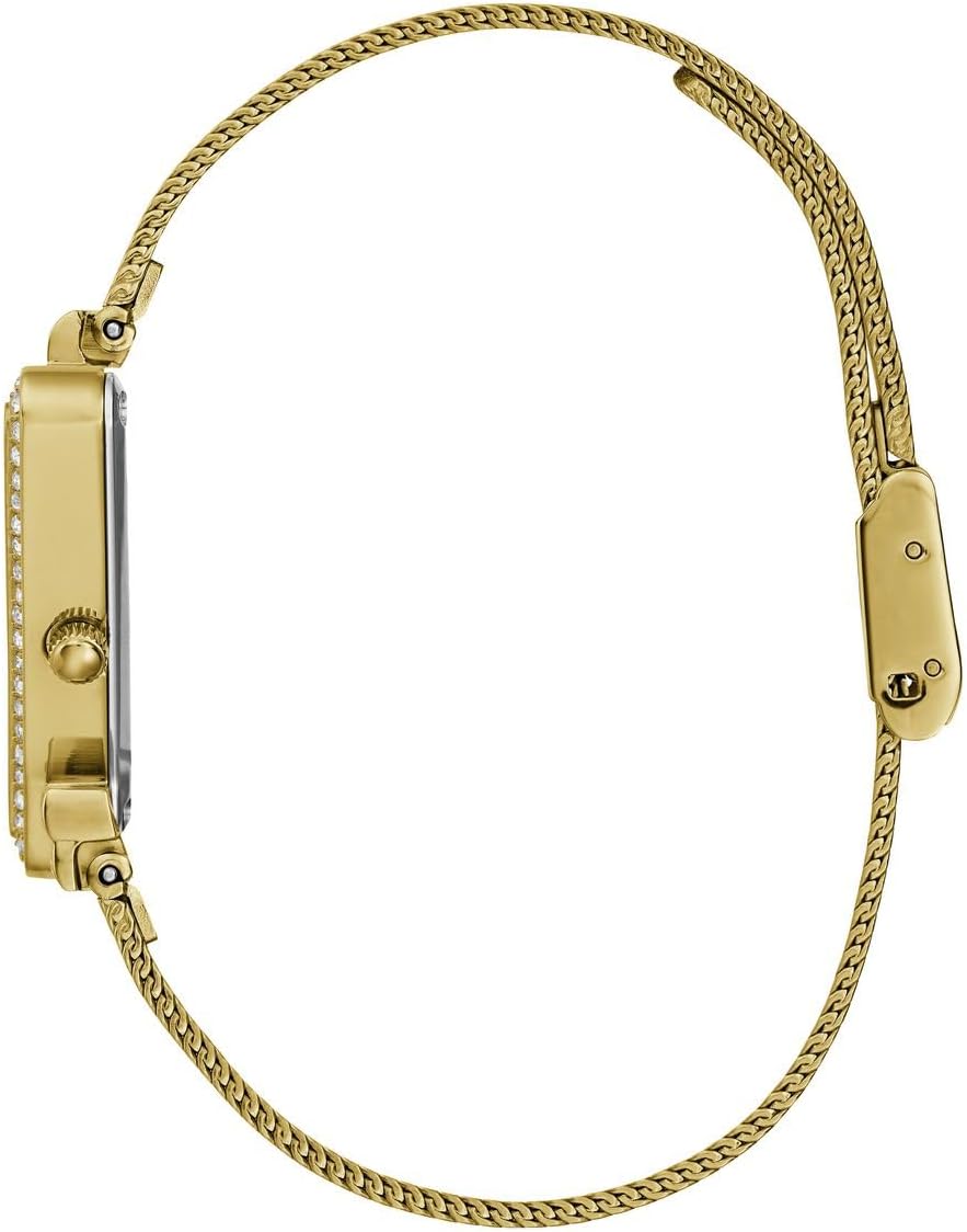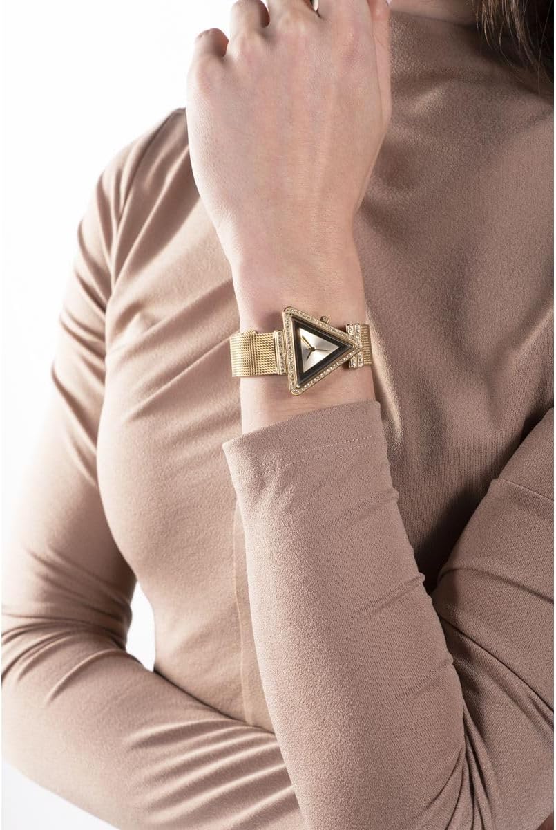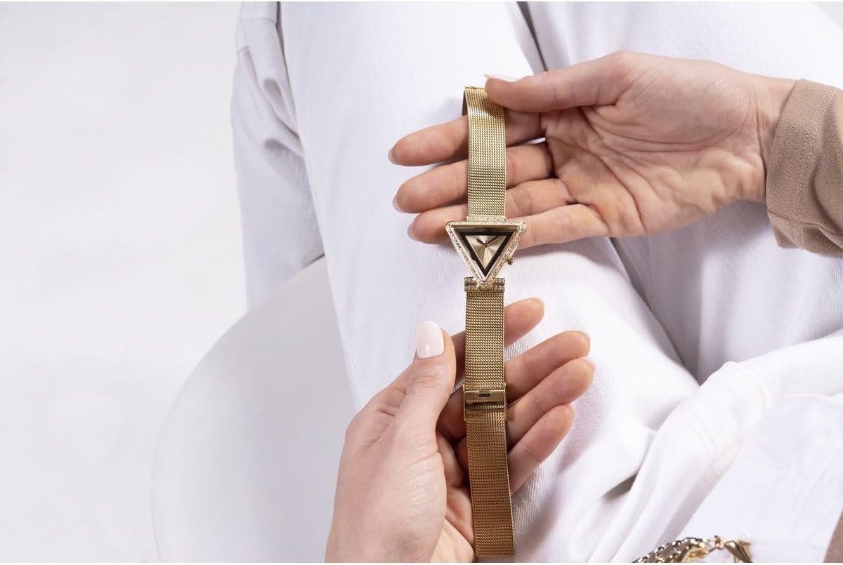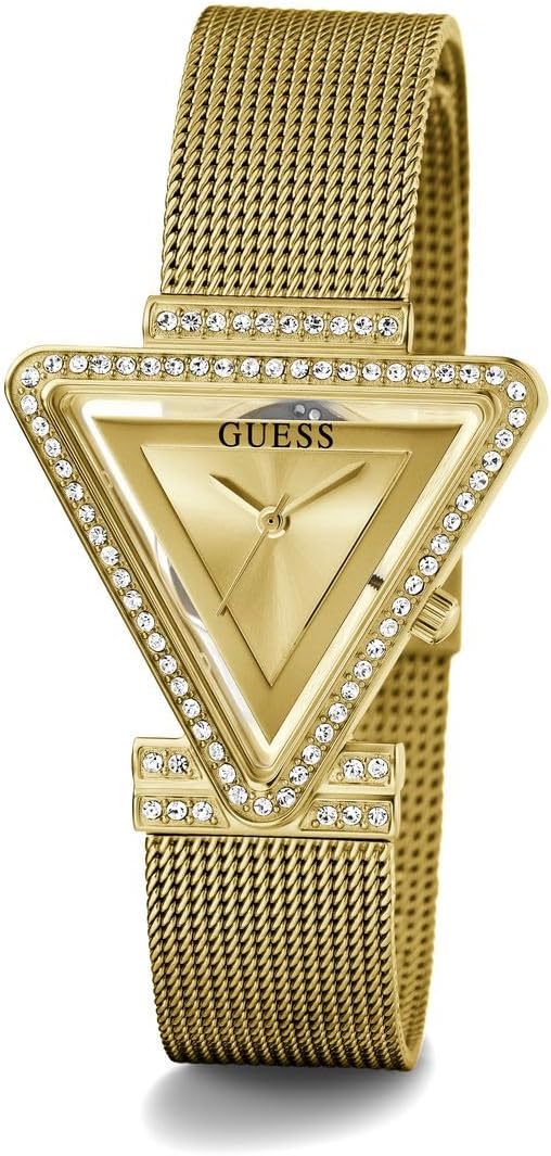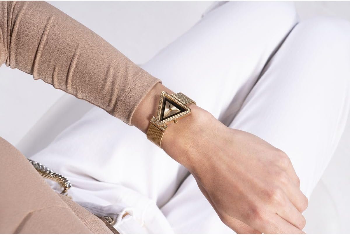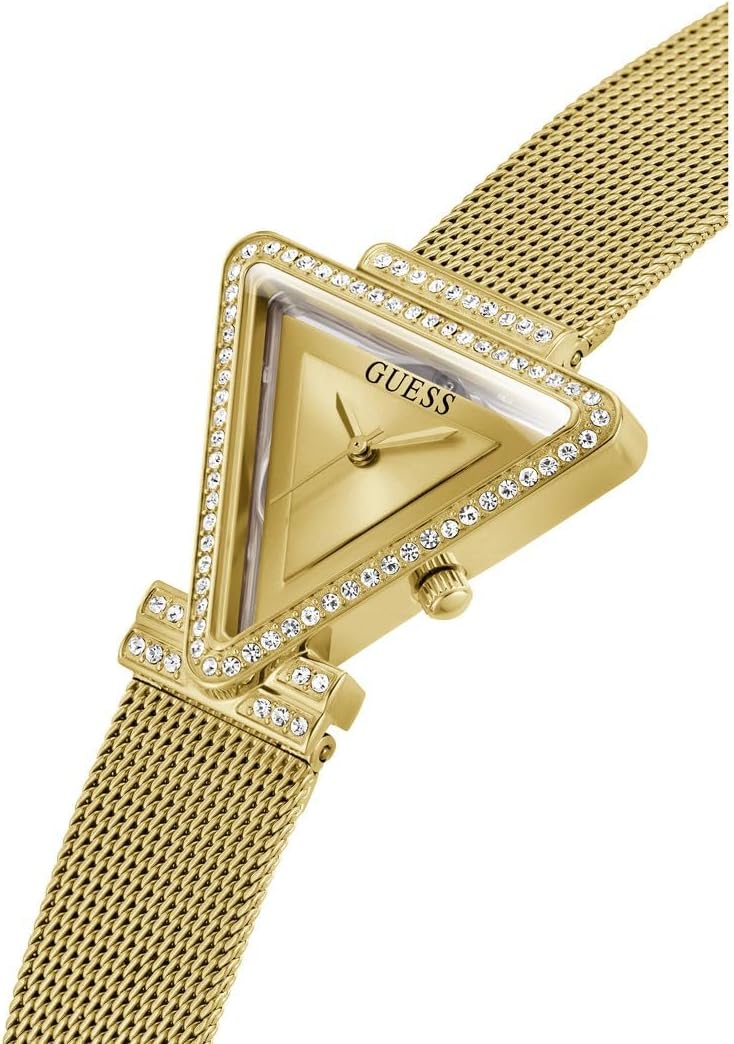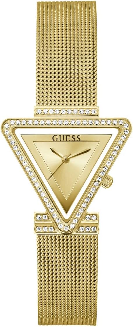 Dit verleidelijke kastontwerp van het GUESS driehoekslogo heeft een volledig glitz look met tonale wijzerplaat en slanke zelfverstelbare mesh armband.