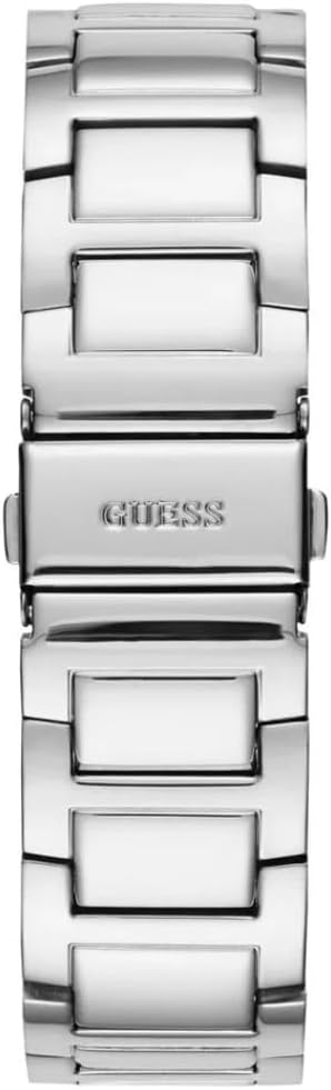 GUESS gepolijste zilveren behuizing met kristallen, sunray zilveren glitter multifunctionele wijzerplaat, gepolijste zilveren armband met kristallen.