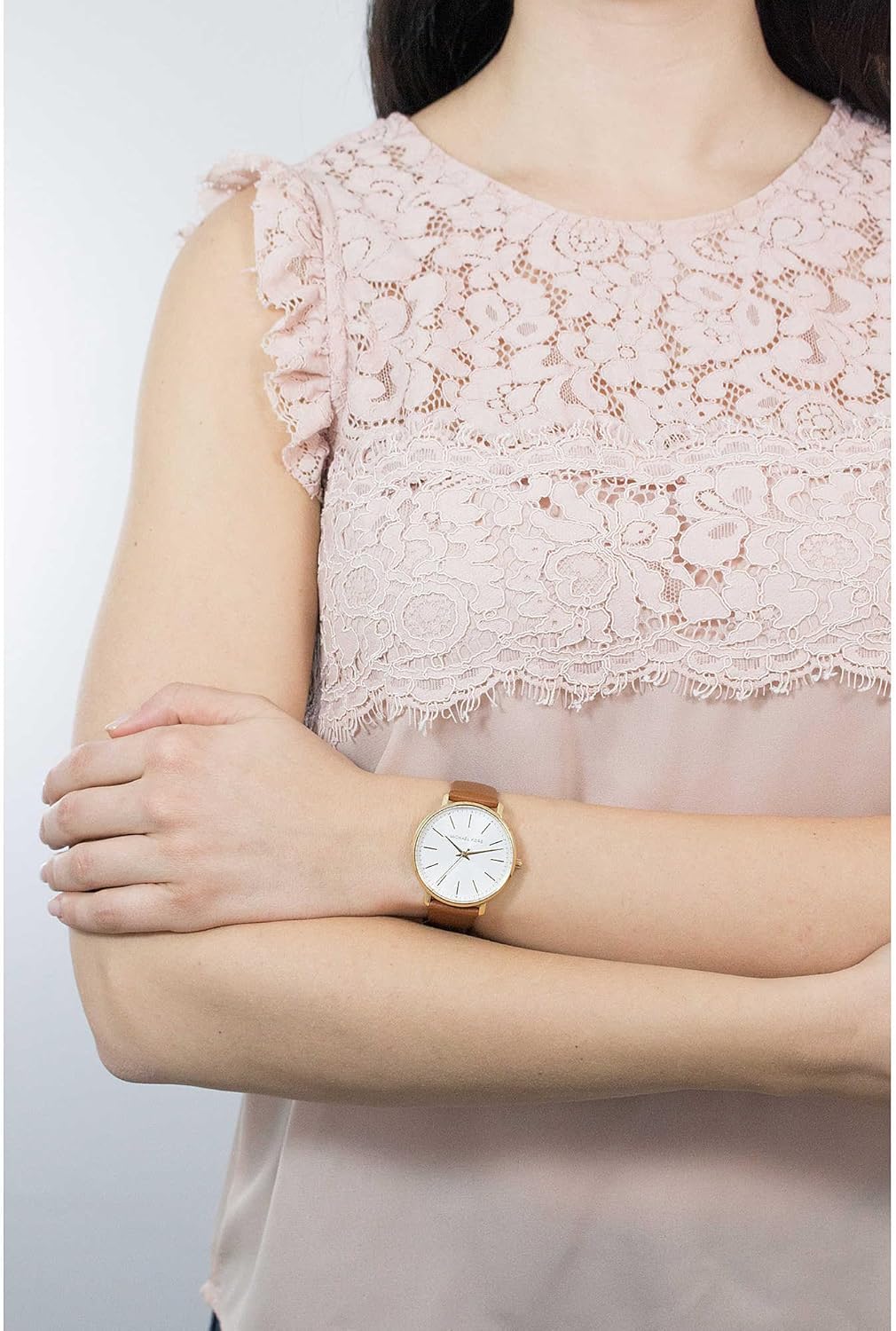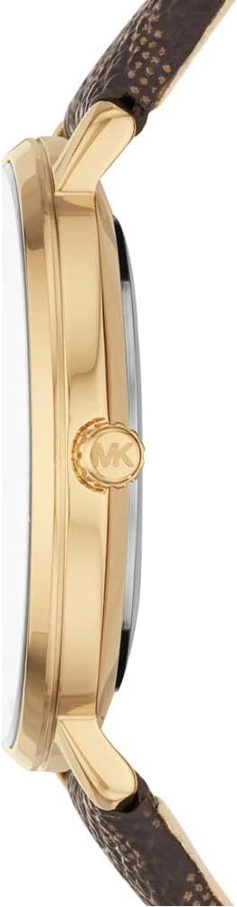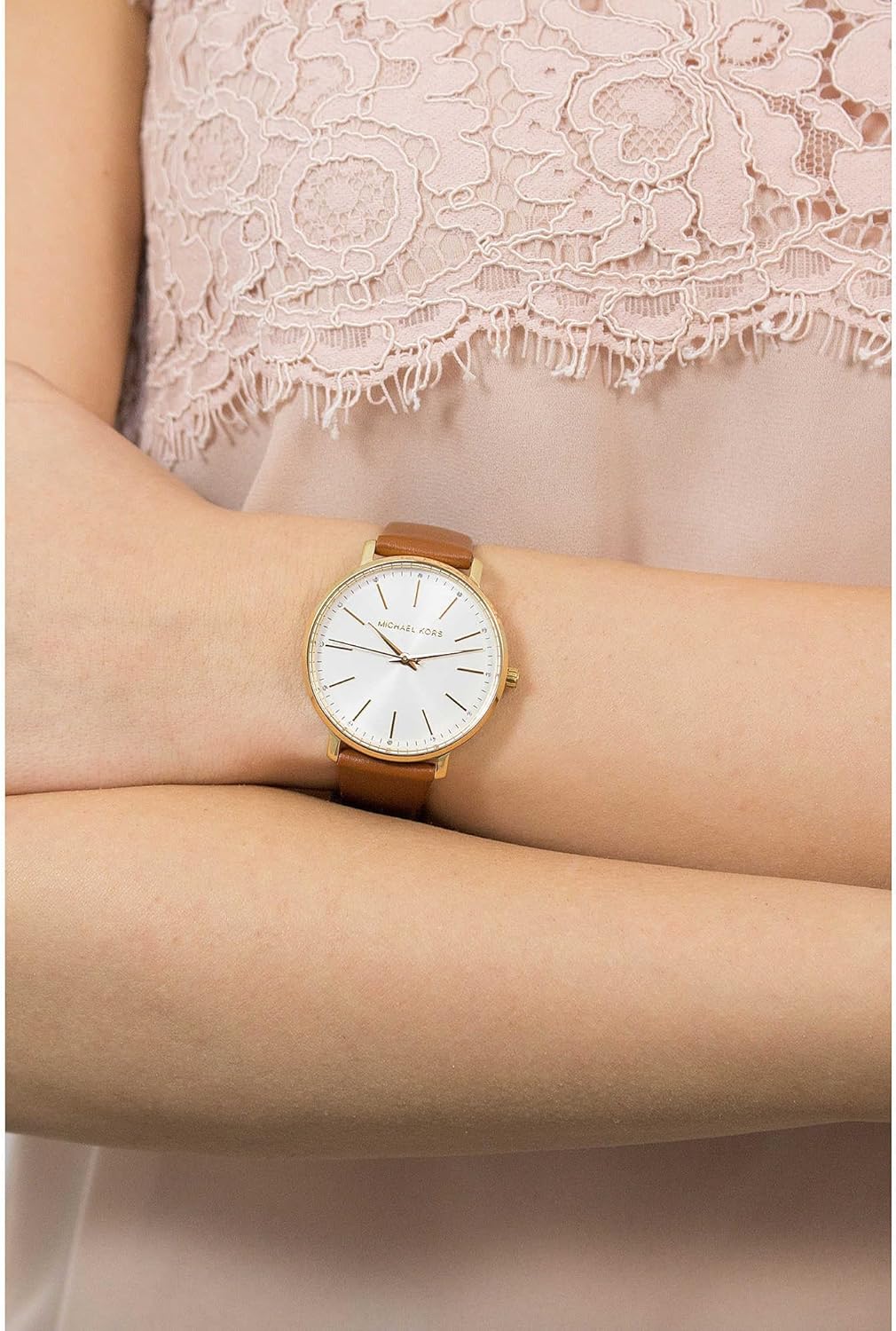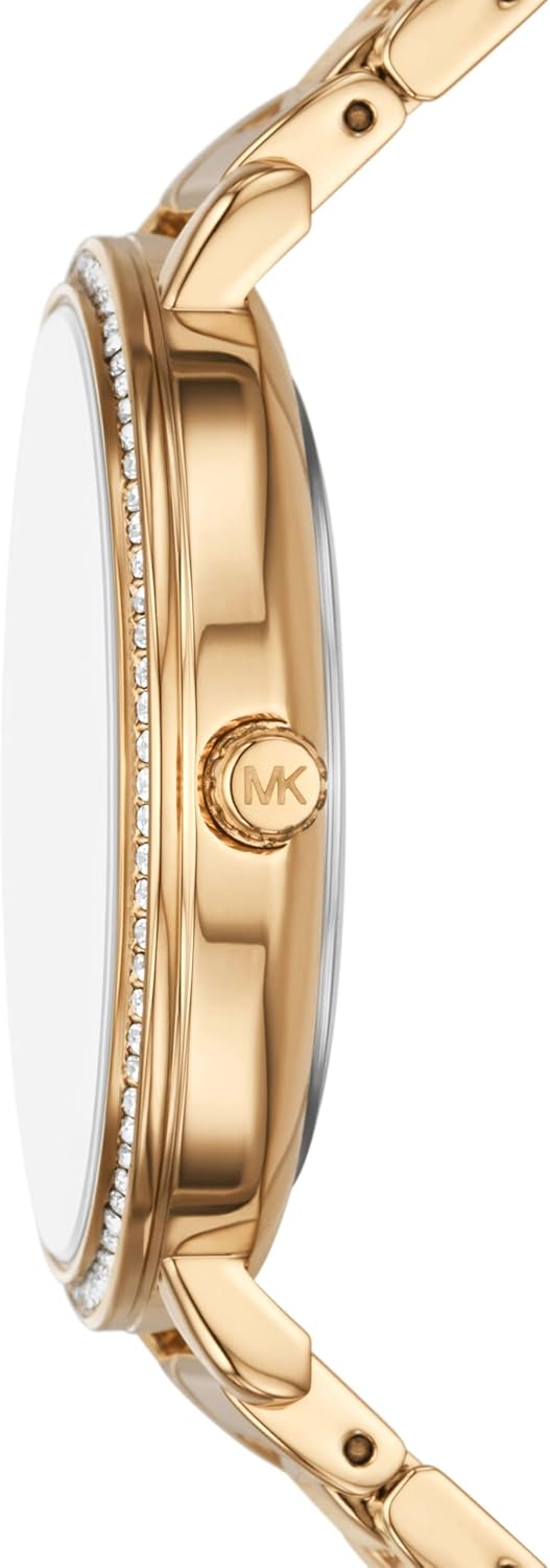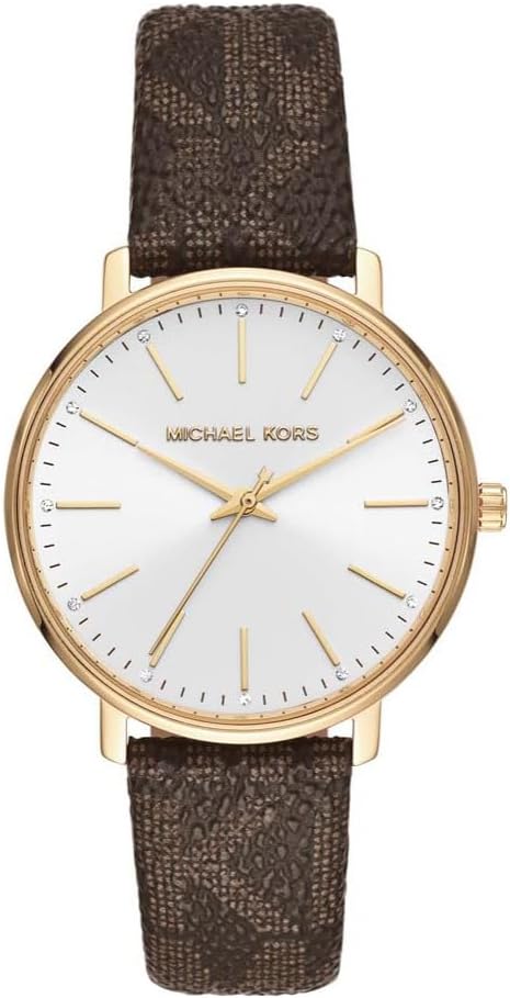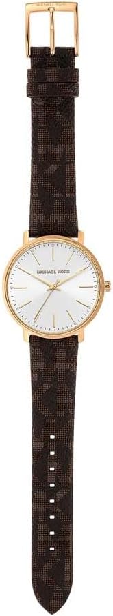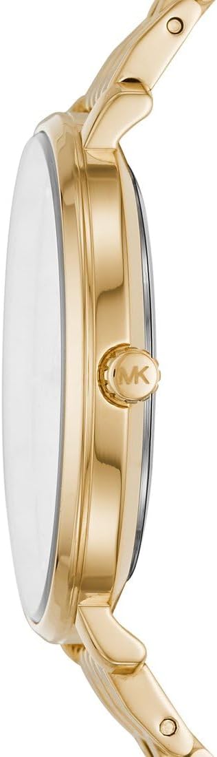 Dit 38 mm grote Pyper-horloge beschikt over een goudkleurige zonnewijzerplaat met goudkleurige staafindices, een driewijzerwerk en een facetgeslepen goudkleurige roestvrijstalen armband.