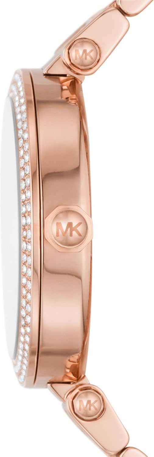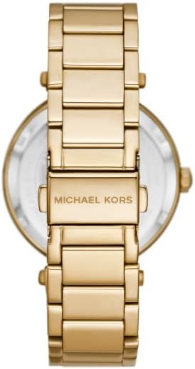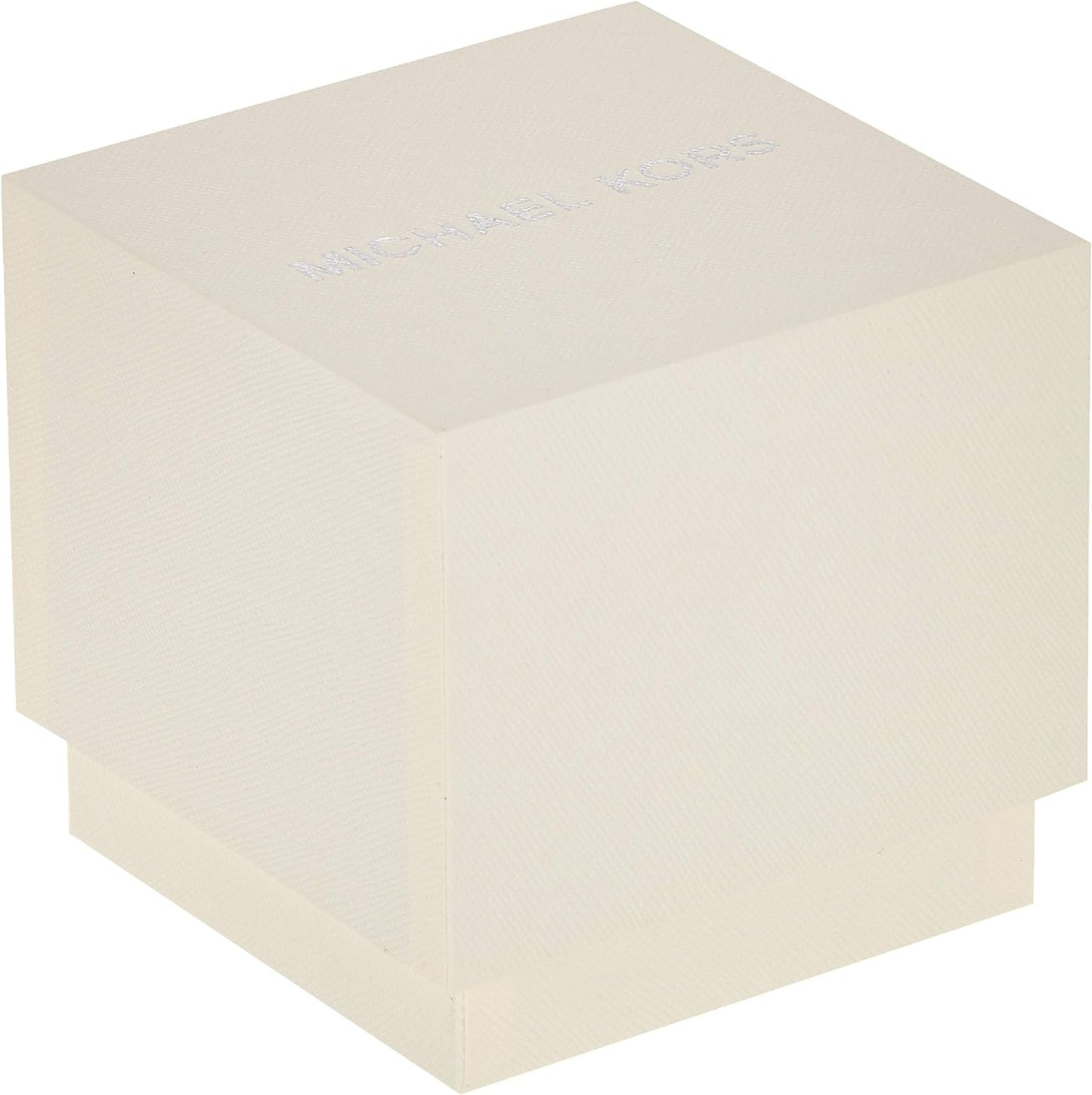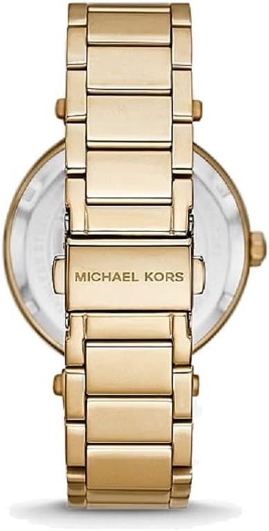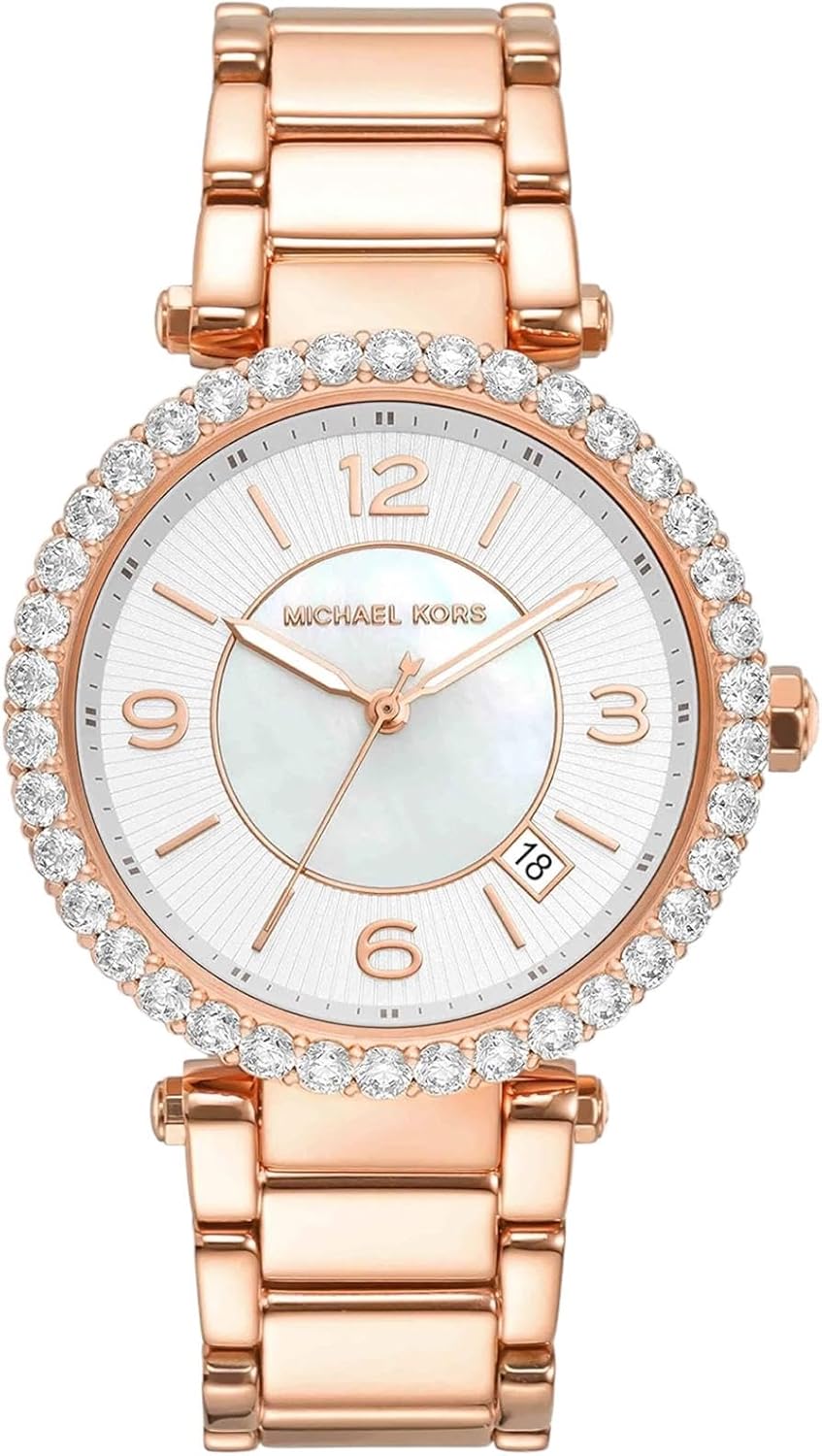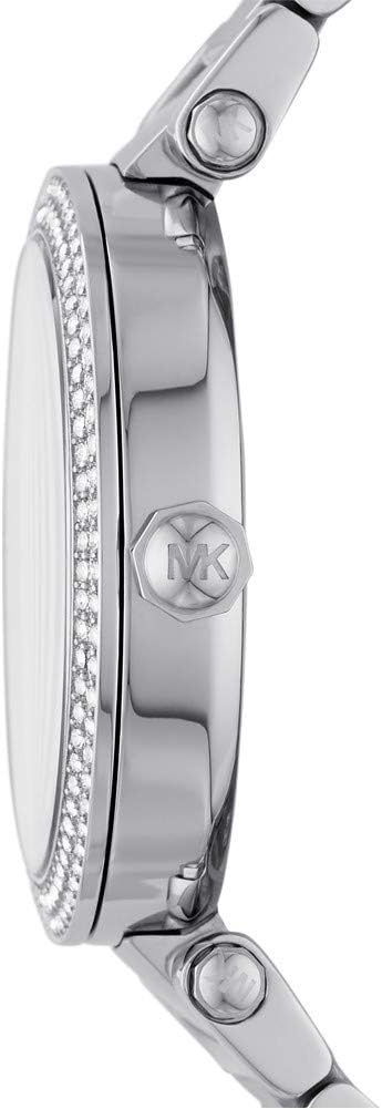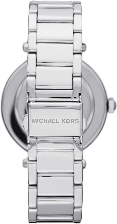 Het 28 mm horloge van Michael Kors Parker beschikt over een witte parelmoer wijzerplaat met kristalindexen, een zilveren behuizing, een pavé-ring, een uurwerk met drie bollen en een stalen armband.