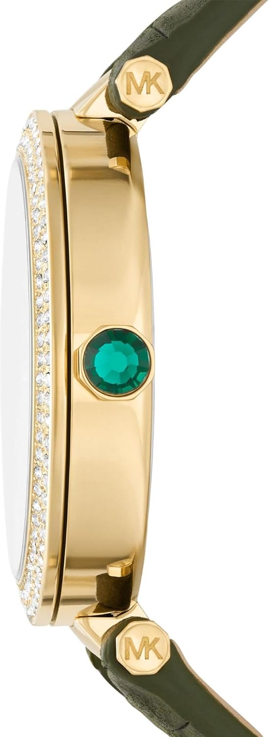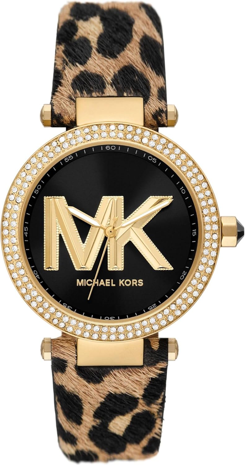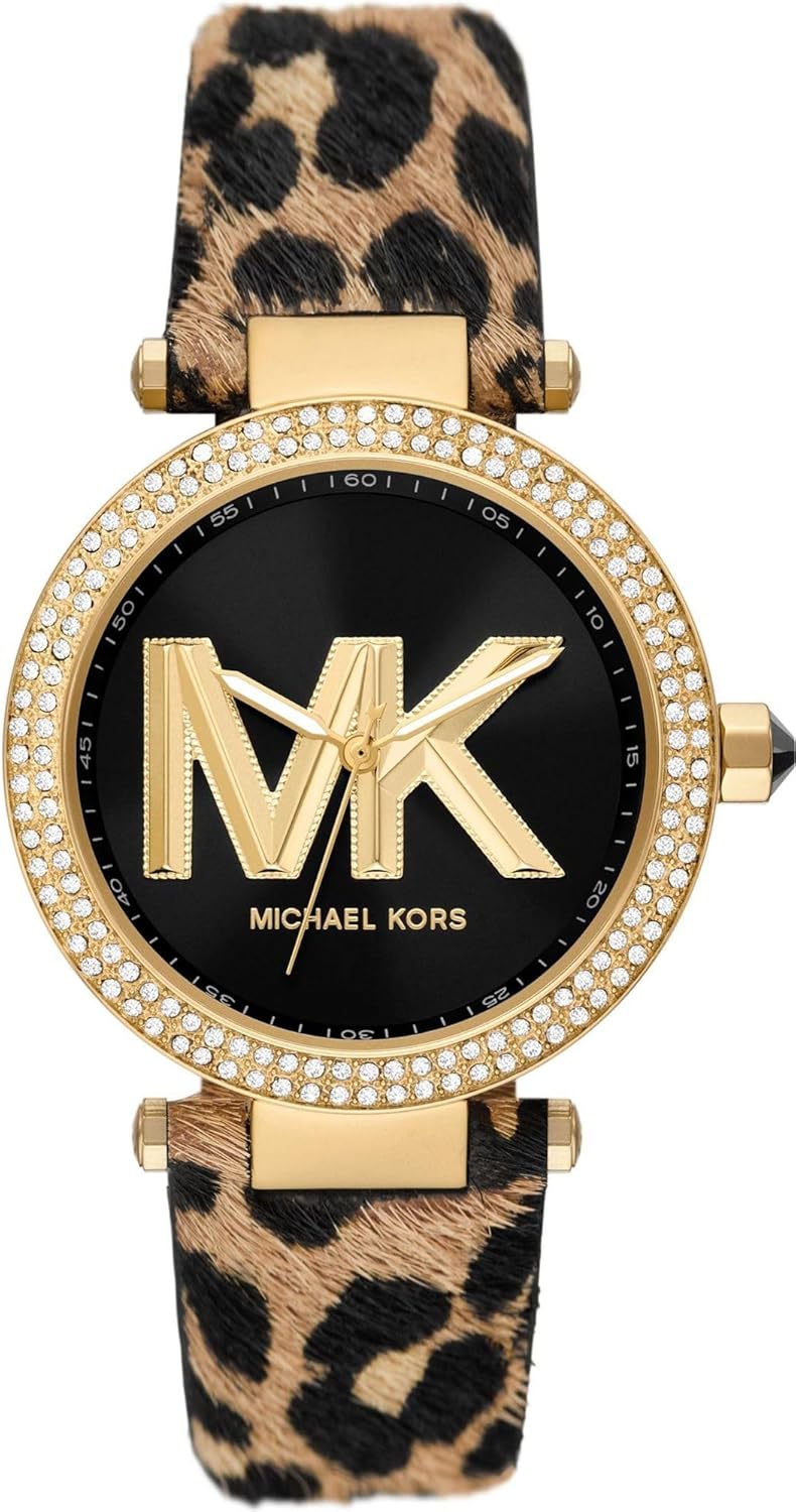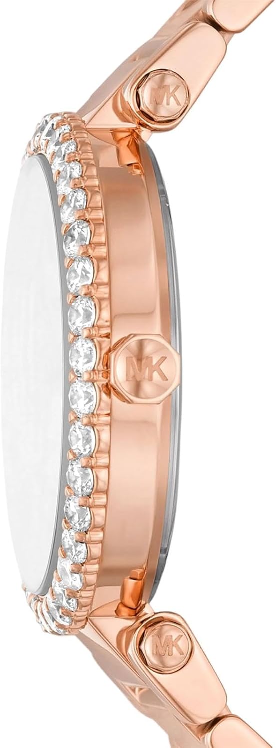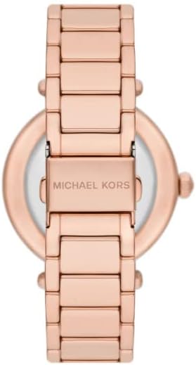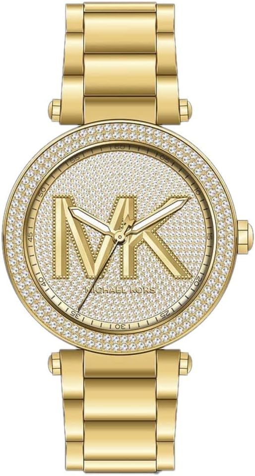 Het 28 mm horloge van Michael Kors Parker beschikt over een witte parelmoer wijzerplaat met kristalindexen, een zilveren behuizing, een pavé-ring, een uurwerk met drie bollen en een stalen armband.