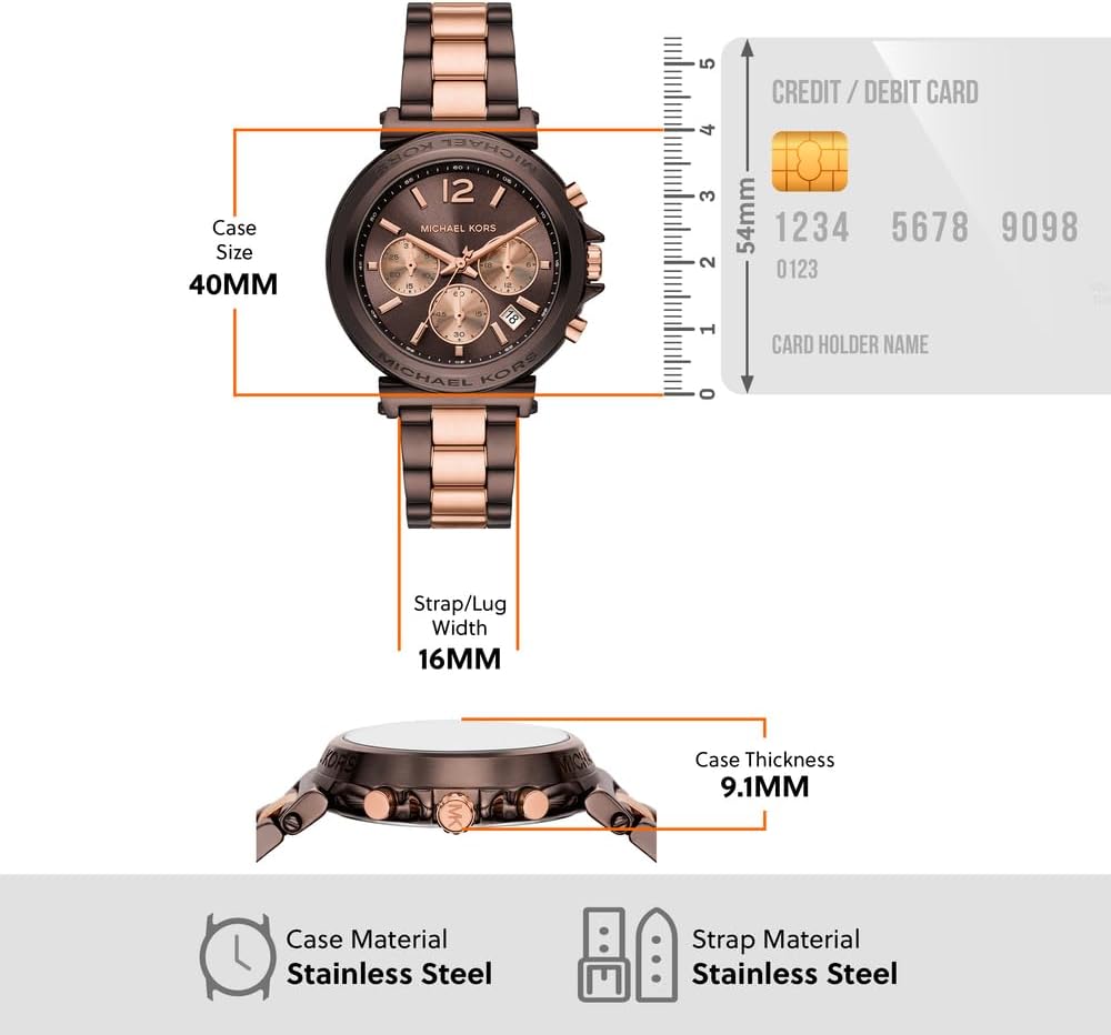 Michael Kors ' 40 mm Maren horloge is voorzien van een chocolade sunray wijzerplaat, chronograaf uurwerk en chocolade en rose goud-tone roestvrij stalen armband.