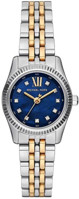 Dit Michael Kors Lexington horloge van 26 mm heeft een glanzende marineblauwe parelmoeren wijzerplaat, uurwerk met drie wijzers en een tweekleurige roestvrijstalen armband.