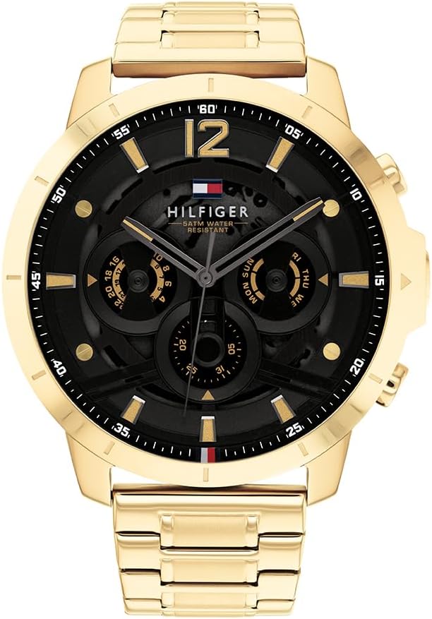 Tommy Hilfiger Analoog multifunctioneel quartz horloge voor mannen met goudkleurige roestvrijstalen armband - 1710511, Zwart, armband