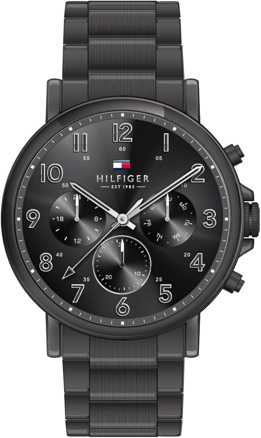 Deze collectie met armbanden van roestvrij staal en zwarte en goudkleurige IP-coating of leer in krokodillenlook presenteert zich in een 44 mm behuizing met glanzende wijzerplaat.