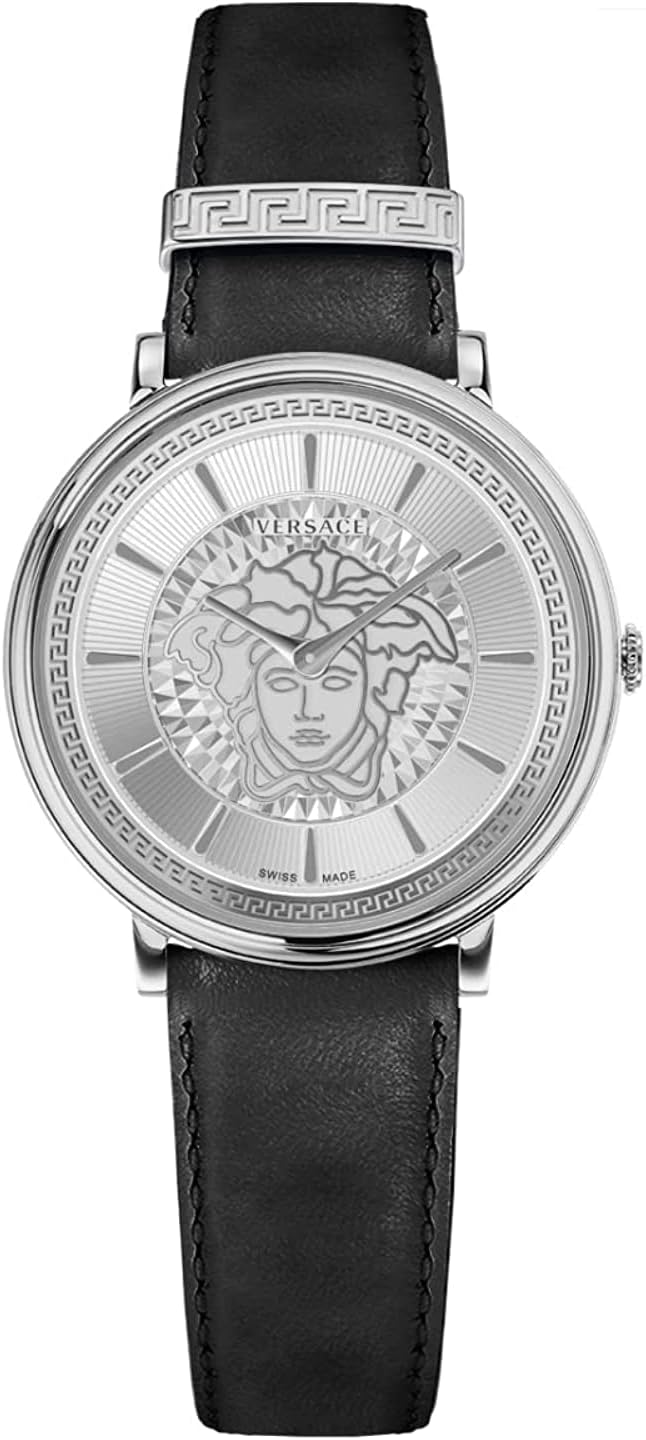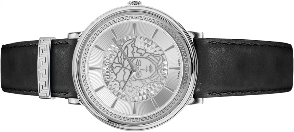 - De zilverkleurige wijzerplaat bevat een Versace-logo in het midden