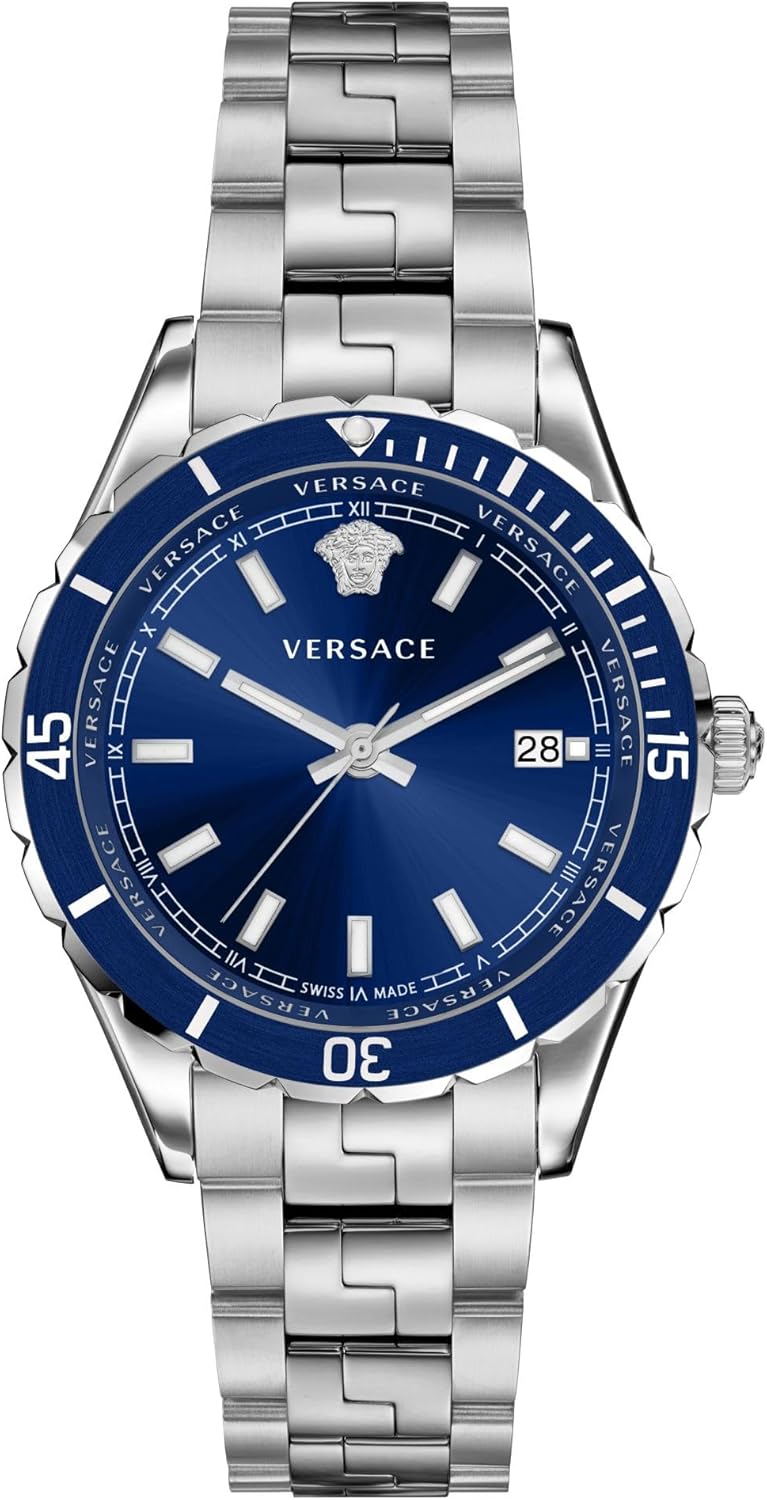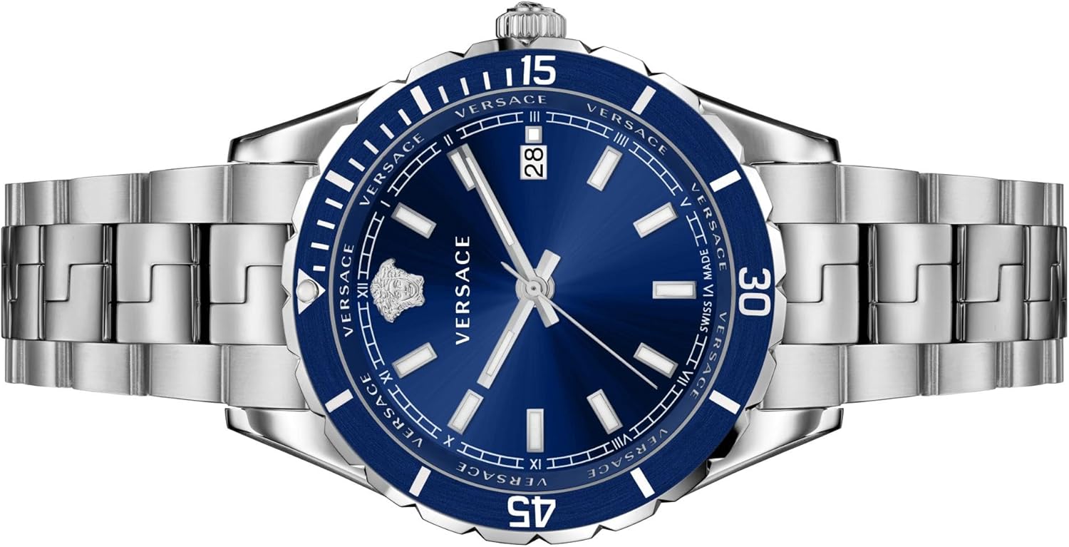 - De blauwe wijzerplaat bevat een Versace logo om 12 uur