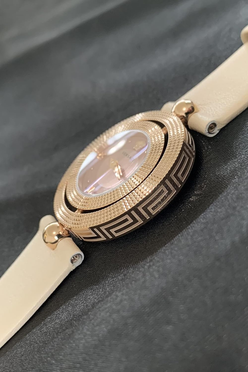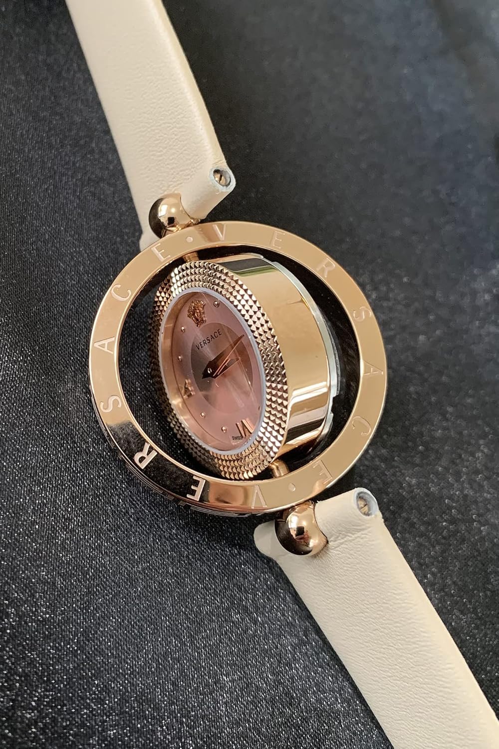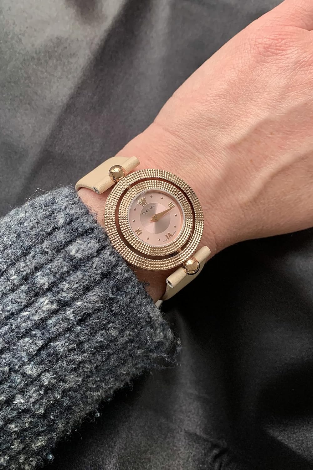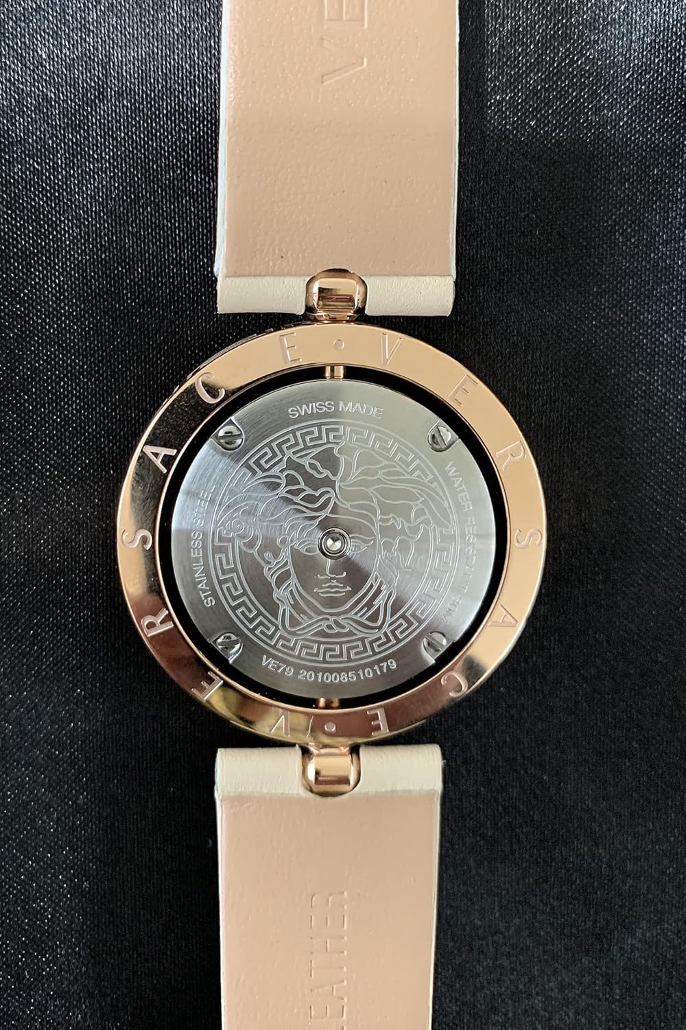 - De wijzerplaat in de kleur Dust Rose bevat een analoge weergave met Romeinse cijfers en gouden Versace-Medusa in het 12-uurs bereik