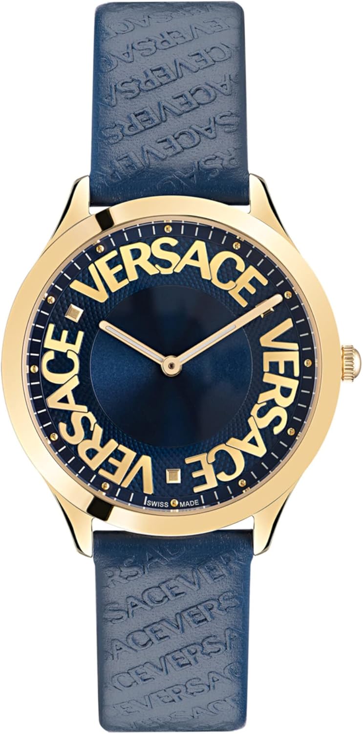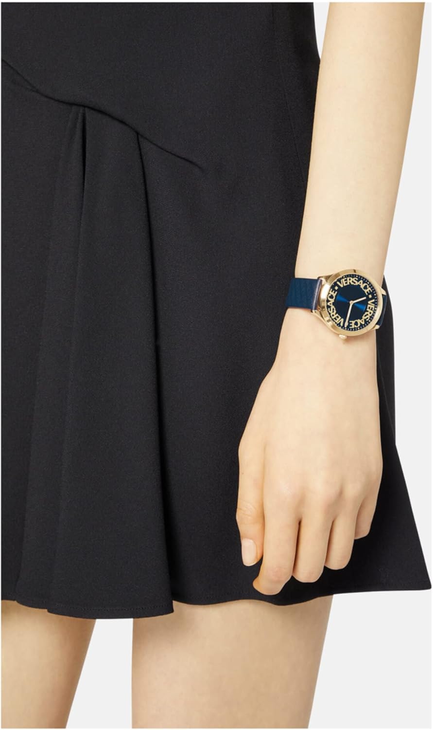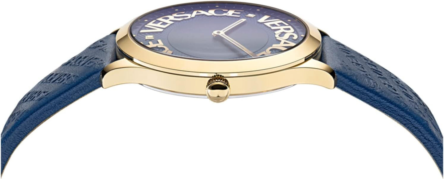 - Het is uitgerust met een kwartsuurwerk en beschikt over een blauwe wijzerplaat met goudkleurige indexen en het logo van Versace.